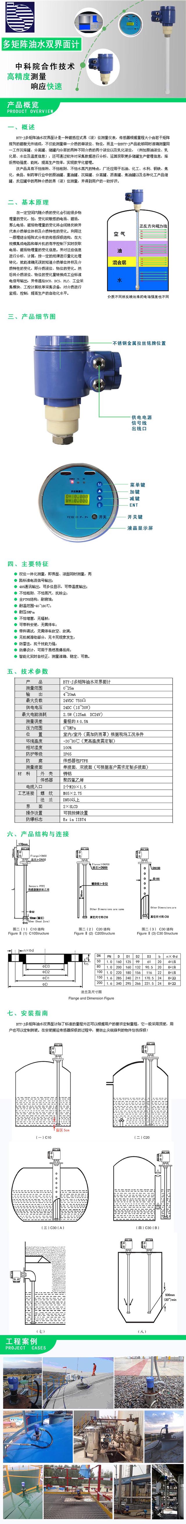 BTY-J多矩陣油水雙界面計是一種磁感應式界(液)位測量儀表,傳感器根據量程大小由若干矩陣排列的磁敏元件組成,不僅能測量單一介質的單液位、物位,而且一臺BTY-J產品能夠同時準確測量同一工作沉降罐、分離罐、儲罐內分層的兩種不同介質的兩個液位以及乳化液位,(例如原油液位、乳化層、水位及溫度信息),還可通過軟件對采集數據進行分析、運算獲取更多儲罐生產管理信息,降低勞動強度、能耗,提高生產效率,實現數字化管理。 該產品具有不怕掛料、不怕粘附、不怕水蒸汽的特點,廣泛應用于石油、化工、水利、鋼鐵、焦化、食品、制藥等行業(yè)中的原油罐、重油罐、沉降罐、分離罐、瀝青罐、焦油罐以及各種化工產品儲罐、反應罐中的兩種介質的界(液)位測量,并得到用戶的一致好評。